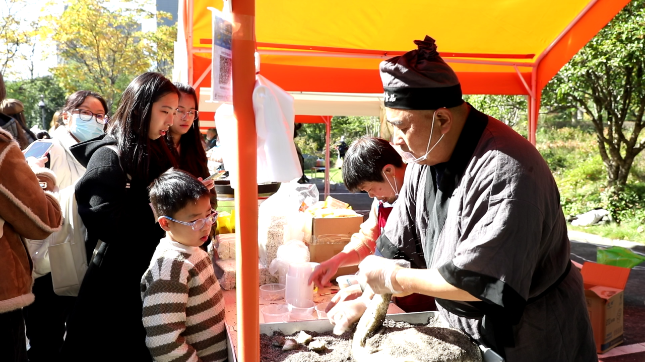 “不仅领到了免费的向日葵,还有鱼羊汤这类暖乎乎的小吃。”学生童语萌捧着汤碗笑着说,感觉特别温暖。市集上,各地特色小吃轮番登场。滋滋冒油的羊肉串、香气扑鼻的缙云烧饼、金黄酥脆的煎饺、软糯香甜的手打麻糍,各类美食摊位前都围满了觅食的同学,校园里处处飘荡着诱人的香味。