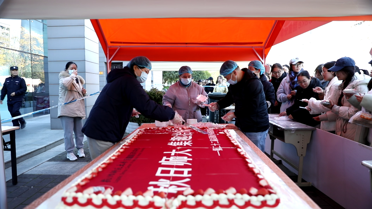 上午11点课间时分,校园美食节的市集摊位前已排起了长队。学校后勤服务中心特意准备了一块超大蛋糕,工作人员现场切块免费发放,同学们围拢在一起,笑着接过甜蜜的蛋糕。不远处,鱼羊鲜摊位前同样人气爆棚,一碗碗热气腾腾的鱼汤端上桌,鲜香味儿弥漫开来,喝上一口,暖意从胃里直传到心里。