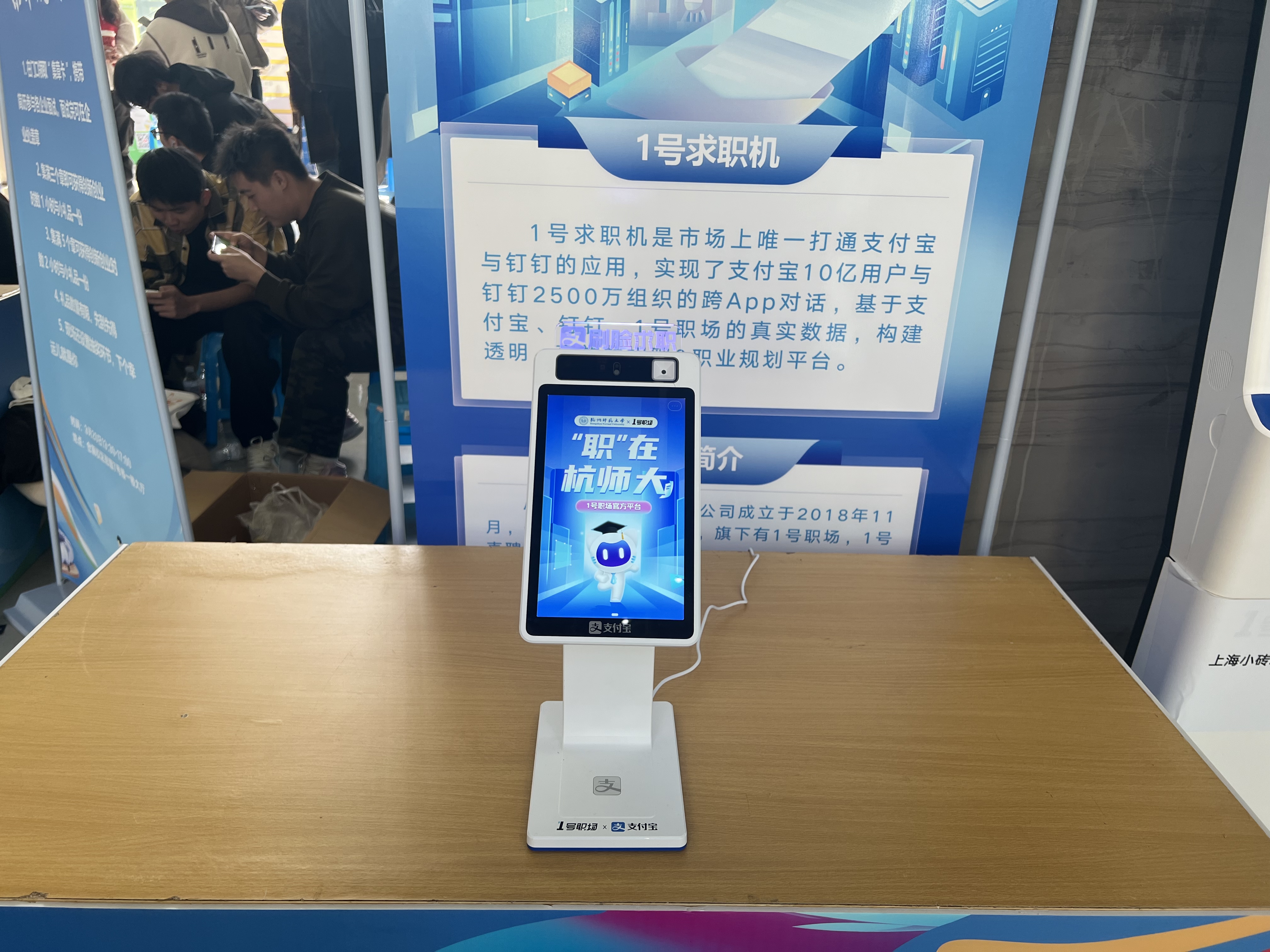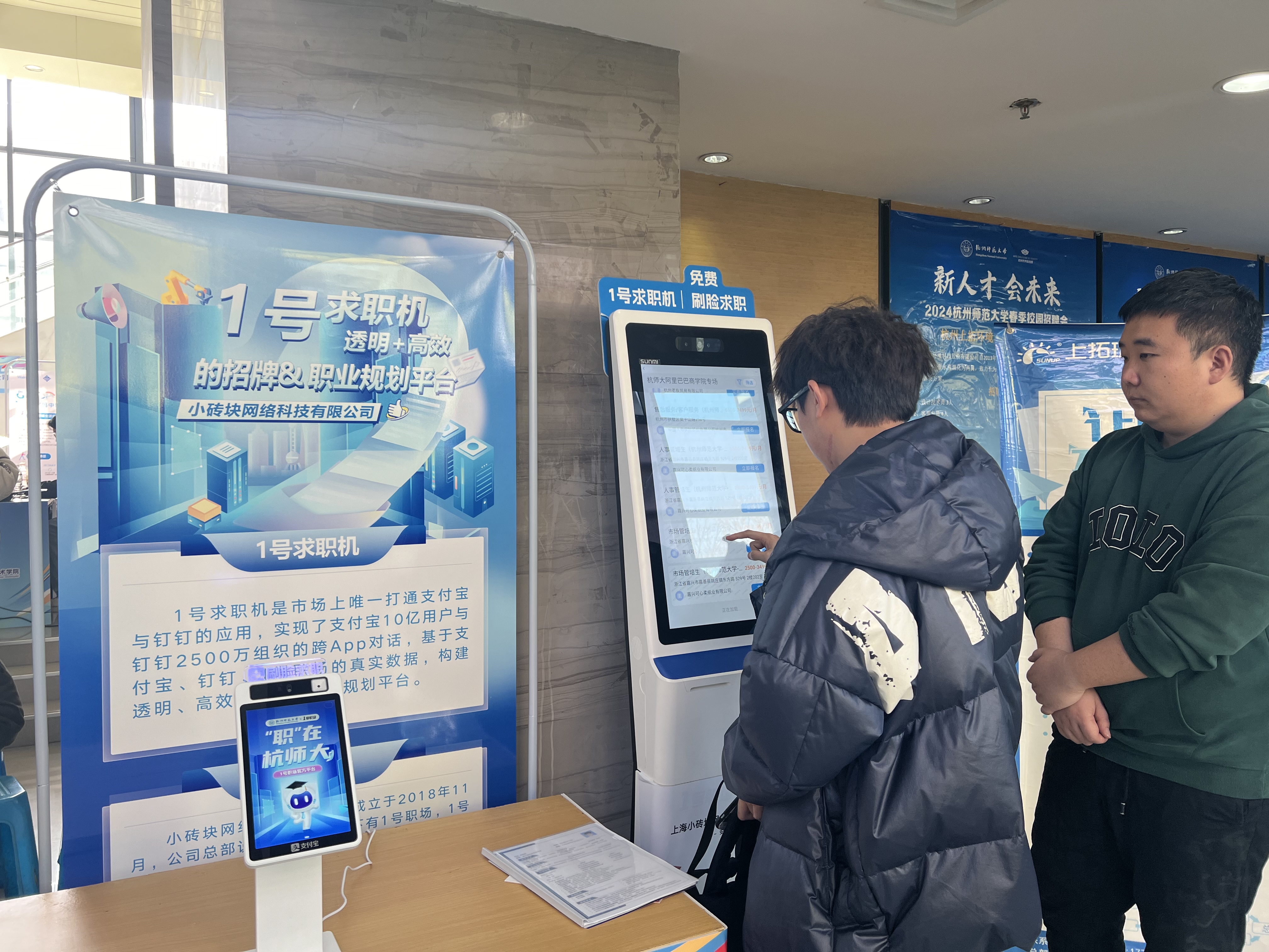 记者发现,招聘会现场还设有数字求职机,为求职流程提供了“科技”助力。这款数字求职机叫做“1号求职机”,毕业生只需要在求职机上点击职位并进行刷脸,即可生成简历数据,点击报名确认之后,企业就会收到毕业生的求职信息,整个过程只需15秒,能够大大提高求职效率。现场工作人员表示,目前1号求职机已经和杭师大的学科专场招聘会同步投放了“特制版”,岗位筛选会按照专业跳转。